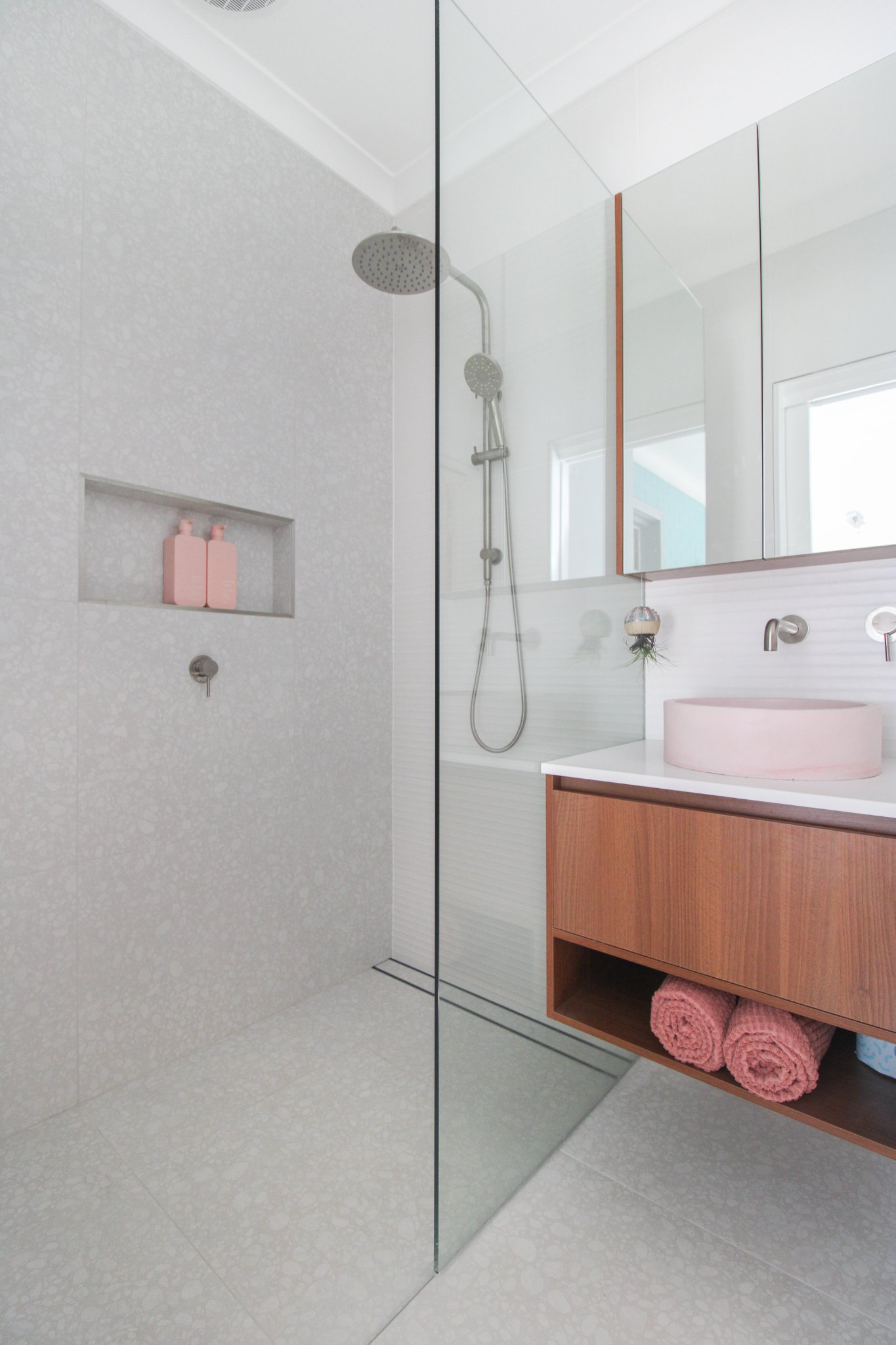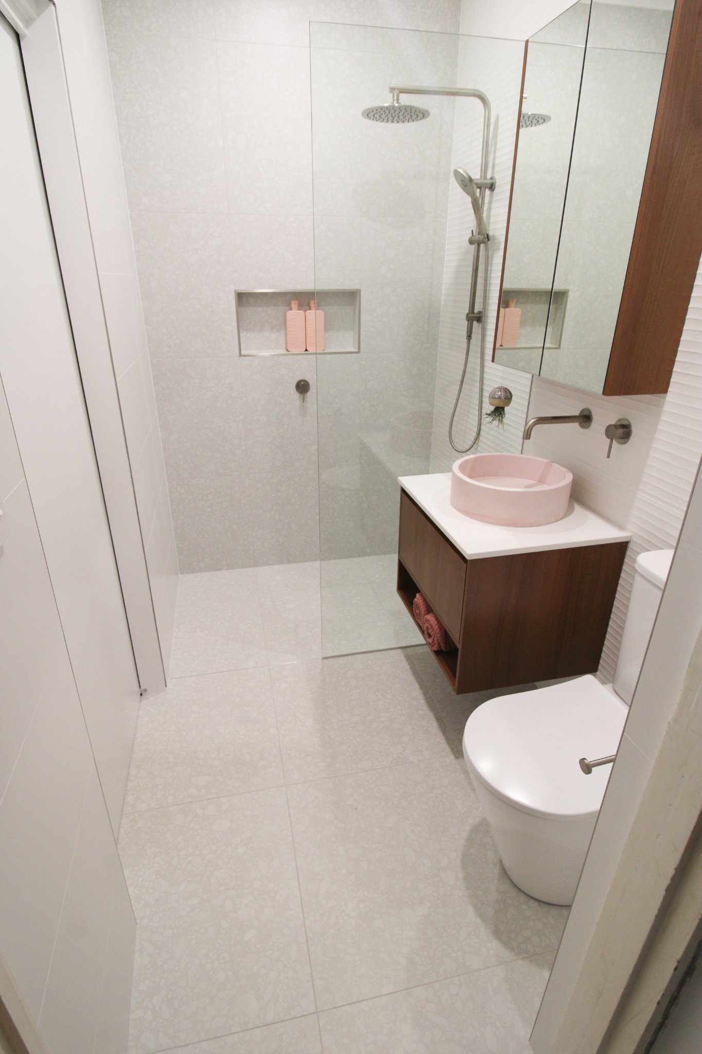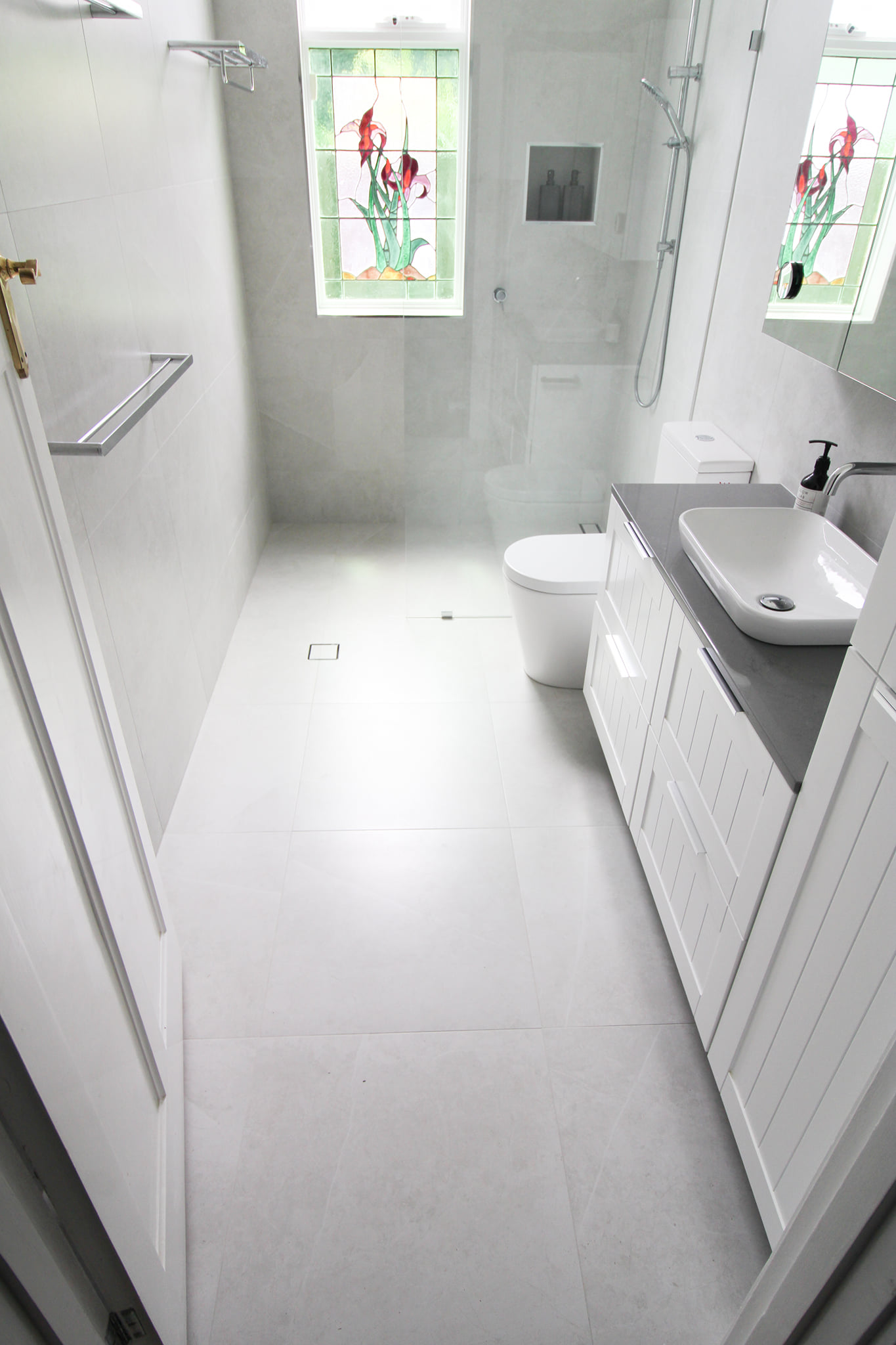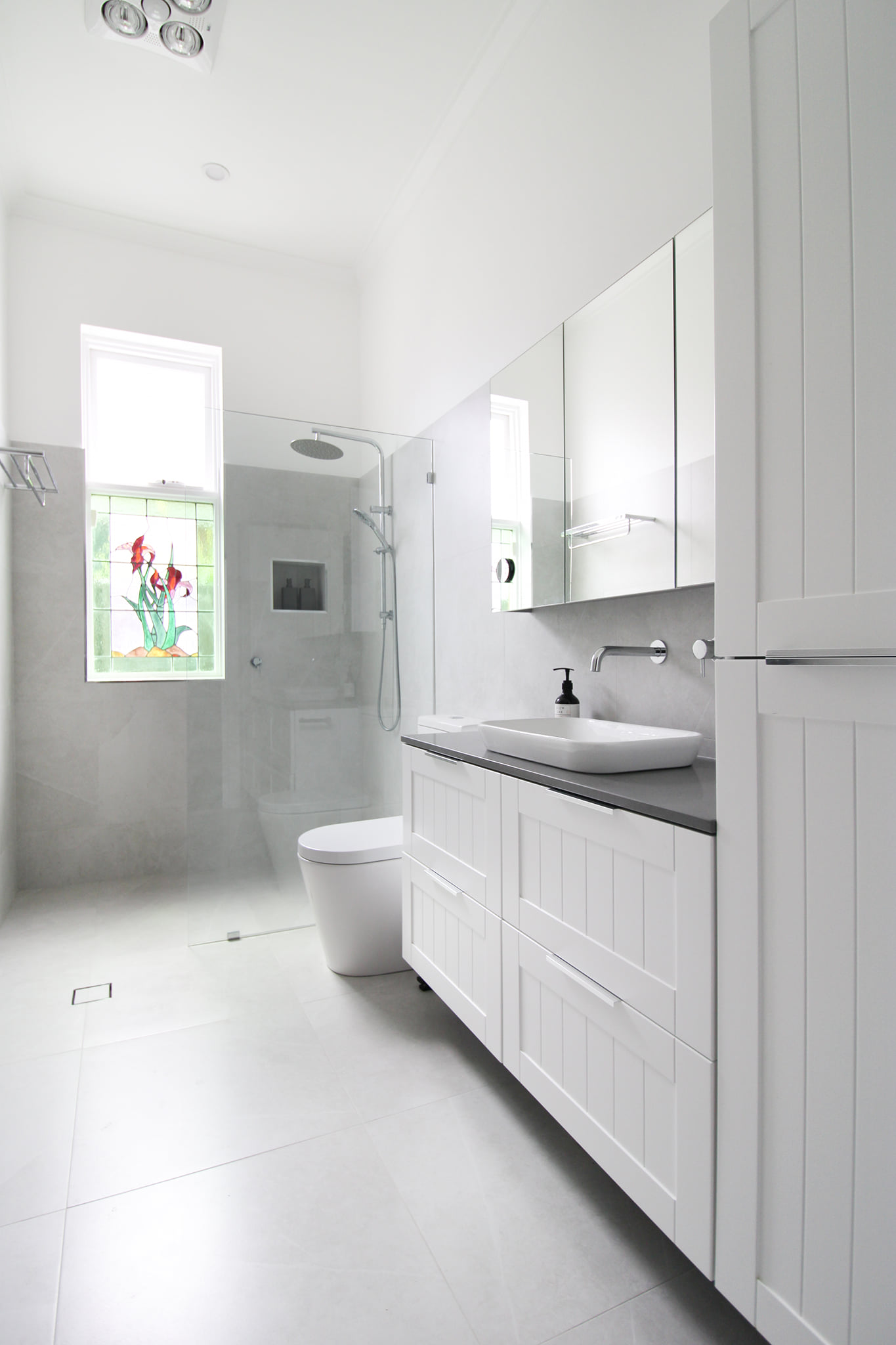 Getting the most out of a small place is this bathroom definition. Being under 2.2m wide this bathroom manages to fit a vanity, toilet, large walk-in shower, and plenty of storage above.