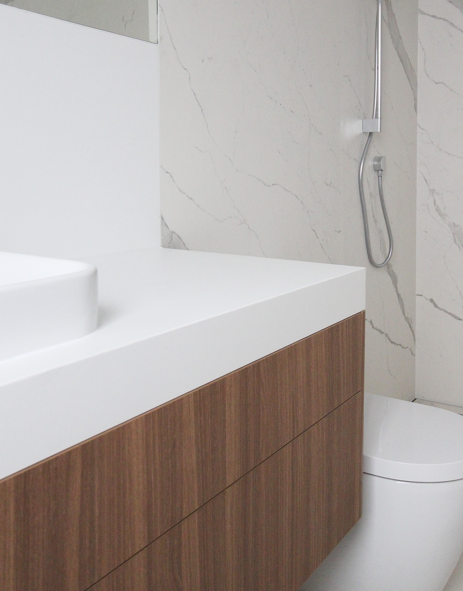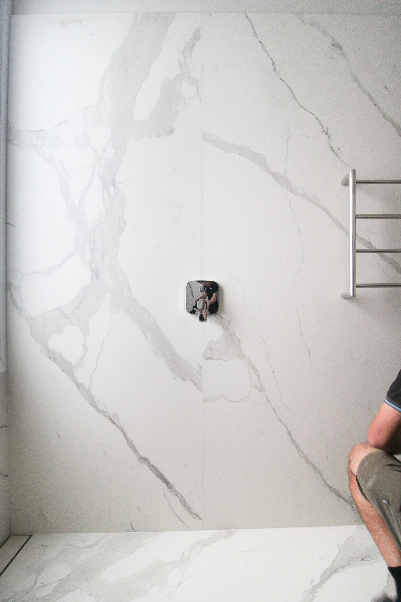 A well-thought-out floor plan has accommodated the use of these stunning 1000mm x 3000mm porcelain panels throughout the entire bathroom with a sacrifice of a more wet room style to accommodate the unique nature of the tiles and prep work around drainage.