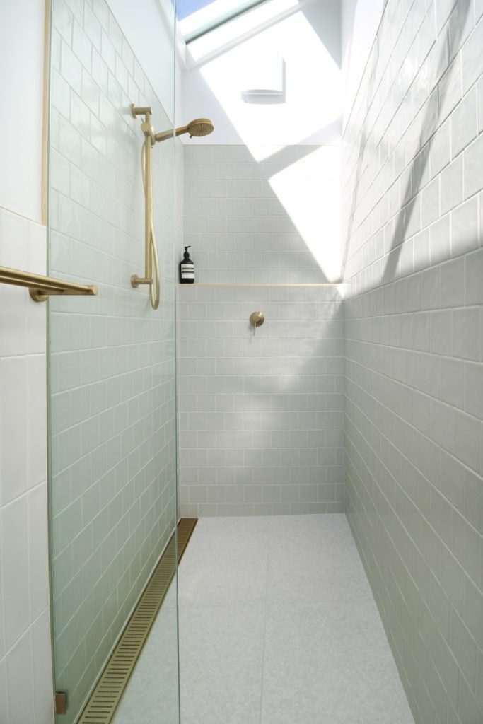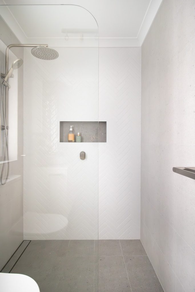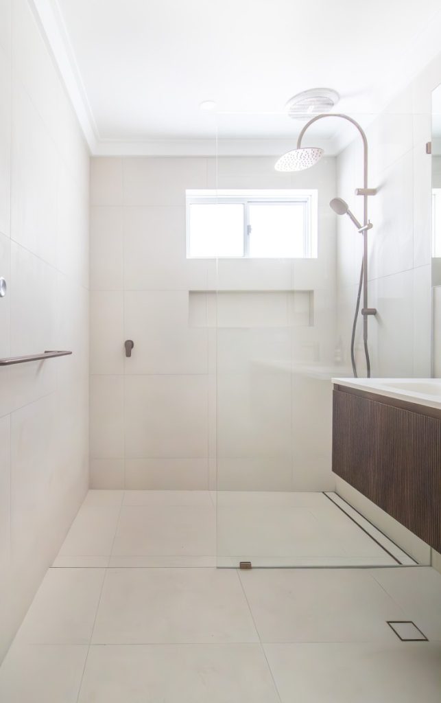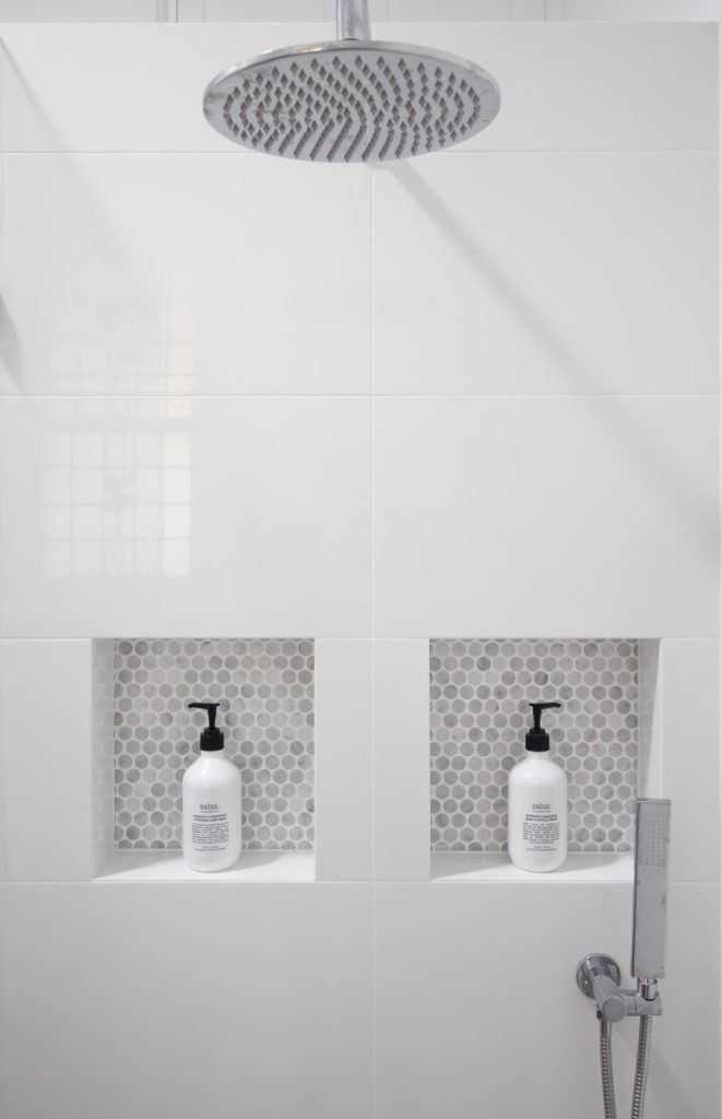 - Wall-to-wall shower shelves are perfect for a renovator looking for a stunning feature wall set-up while also getting a lot of storage.
